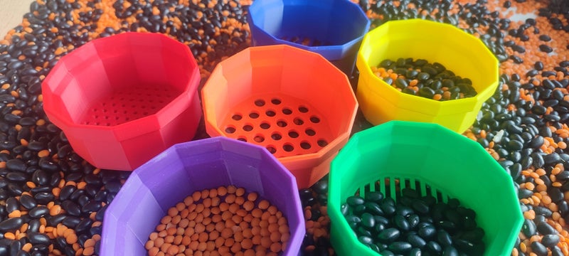 De zeefjesset bestaat uit vier verschillende zeefjes en twee bakjes. Ze zijn te gebruiken in de sensorische speelbakken met rijst, bonen, zaden of water. Ook maken ze gave afdrukken in kinetisch zand en klei. De twee bakjes hebben aan de onderkant een patroon, zodat je mooie afdrukken kunt maken. De zeefjesset is voorzien van een CE-keurmerk. Tijdens het Creatief speeluurtje en bij ons thuis, wordt er met de zeefjesset enthousiast gespeeld. De set kost €22,50, exclusief verzendkosten. De set kan opgehaald worden in Lent (Nijmegen) en het kan worden verstuurd via DHL naar je huis (€6,45) of een pakketpunt (€5,45). Als je interesse hebt kun je mailen naar info@latenwespelen.com.